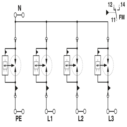 Phoenix Contact 2908264 Plug-in lightning arresters that meet Type 1/Class I standards can be used in 3-phase power supply networks where the neutral and earth conductors are designated as N and PE respectively, allowing for higher nominal voltages without leakage current.