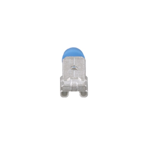 Panduit DV14-250P-MYY The vibration resistant piggyback disconnect is made of brass and is tin-plated. It is barrel insulated in blue vinyl housing. It has a tab size of 0.25 x 0.032" (6.3 x 0.8 mm) and supports a wire range of 16-14 AWG (1.5-2.5 mm²). It is 0.88" (22.4 mm) long and 0.29" (7.4 mm) wide. The disconnect has a standard barrel configuration and a sleeved barrel. It comes in boxes of 1000.
