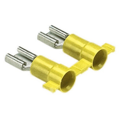Panduit DV10-250C-2K The vibration resistant female disconnect is made of brass and is tin-plated. It is barrel insulated in yellow vinyl housing. It has a tab size of 0.250 x 0.032" (6.3 x 0.8 mm) and supports a wire range of 12-10 AWG (4.0-6.0 mm²). It is 0.95" (24.1 mm) long and 0.29" (7.4 mm) wide. The disconnect has a standard barrel configuration and a butted seam barrel. It comes in reels of 2000.
