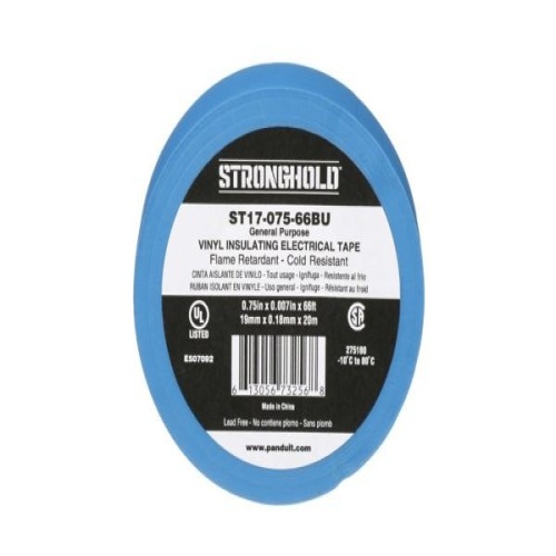 Panduit ST17-075-66BU StrongHold ST17-075-66BU General Purpose PVC Electrical Tape has non-corrosive and pressure-sensitive adhesive, which eliminates the need for heat, moisture or other catalysts during application. Its high elongation provides excellent conformability properties and it is .75" x 66' x .007” in size. It is blue in color and comes individually cellophane wrapped. Suitable as primary insulation when used for splicing up 600 Volts or 80∘C (176∘F).