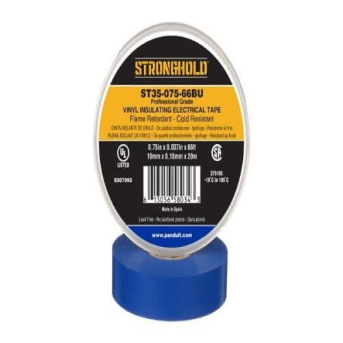 Panduit ST35-075-66BU StrongHold ST35-075-66BU Professional Grade PVC Electrical Tape is a pressure sensitive vinyl electrical tape that applies easily and provides a high level of performance over a range of temperatures. It has excellent elasticity and insulating properties and it is .75" x 66' x .007" in size. It is blue in color and comes in an individual plastic puck. Suitable as primary insulation when used for splicing up 600 Volts or 80∘C (176∘F) and can be used as protective jacketing.