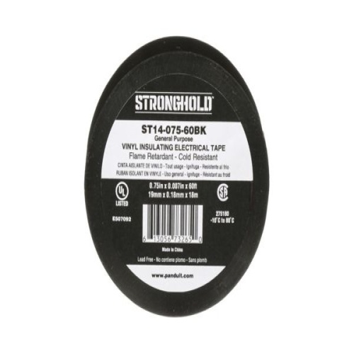 Panduit ST14-075-60BK StrongHold ST14-075-60BK General Purpose PVC Electrical Tape has non-corrosive and pressure-sensitive adhesive, which eliminates the need for heat, moisture or other catalysts during application. Its high elongation provides excellent conformability properties and it is .75" x 60' x .007” in size. It is black in color and comes individually cellophane wrapped. Suitable as primary insulation when used for splicing up 600 Volts or 80∘C (176∘F).