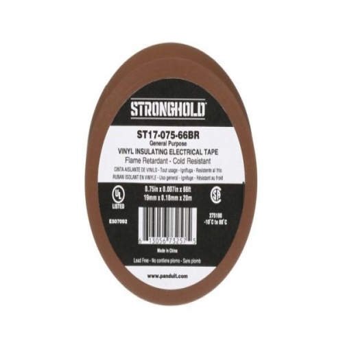 Panduit ST17-075-66BR StrongHold ST17-075-66BR General Purpose PVC Electrical Tape has non-corrosive and pressure-sensitive adhesive, which eliminates the need for heat, moisture or other catalysts during application. Its high elongation provides excellent conformability properties and it is .75" x 66' x .007” in size. It is brown in color and comes individually cellophane wrapped. Suitable as primary insulation when used for splicing up 600 Volts or 80∘C (176∘F).