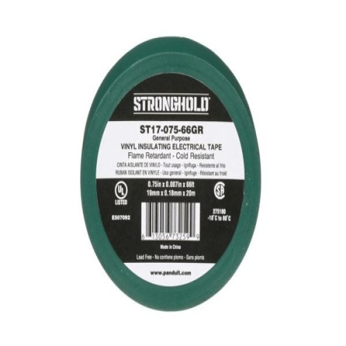 Panduit ST17-075-66GR StrongHold ST17-075-66GR General Purpose PVC Electrical Tape has non-corrosive and pressure-sensitive adhesive, which eliminates the need for heat, moisture or other catalysts during application. Its high elongation provides excellent conformability properties and it is .75" x 66' x .007” in size. It is green in color and comes individually cellophane wrapped. Suitable as primary insulation when used for splicing up 600 Volts or 80∘C (176∘F).