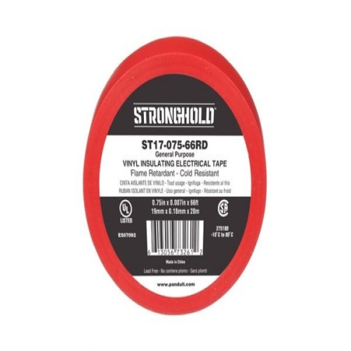 Panduit ST17-075-66RD StrongHold ST17-075-66RD General Purpose PVC Electrical Tape has non-corrosive and pressure-sensitive adhesive, which eliminates the need for heat, moisture or other catalysts during application. Its high elongation provides excellent conformability properties and it is .75" x 66' x .007” in size. It is red in color and comes individually cellophane wrapped. Suitable as primary insulation when used for splicing up 600 Volts or 80∘C (176∘F).