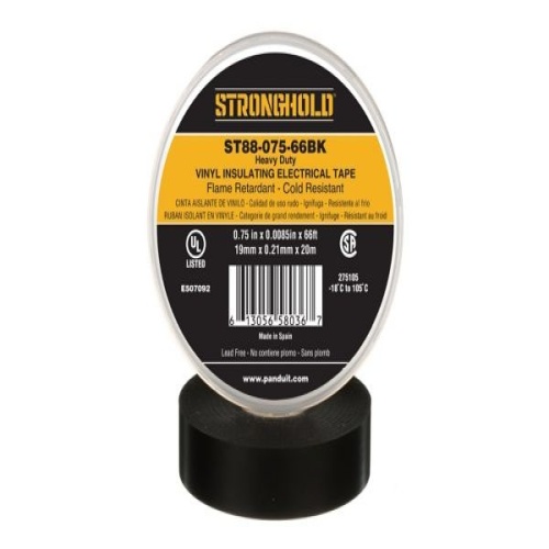 Panduit ST88-075-66BK StrongHold ST88-075-66BK Heavy Duty PVC Electrical Tape is an all-weather, pressure sensitive vinyl electrical tape that applies easily and provides a high level of performance over a range of temperatures. It is .75" x 66' x .0085” in size, black in color and comes individually cellophane wrapped. Suitable as primary insulation when used for splicing up 600 Volts or 80∘C (176∘F) and can be used as protective outer jacket in low temperature applications.