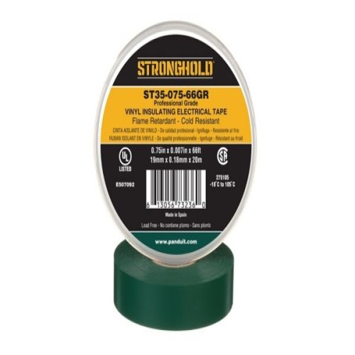 Panduit ST35-075-66GR StrongHold ST35-075-66GR Professional Grade PVC Electrical Tape is a pressure sensitive vinyl electrical tape that applies easily and provides a high level of performance over a range of temperatures. It has excellent elasticity and insulating properties and it is .75" x 66' x .007" in size. It is green in color and comes in an individual plastic puck. Suitable as primary insulation when used for splicing up 600 Volts or 80∘C (176∘F) and can be used as protective jacketing.