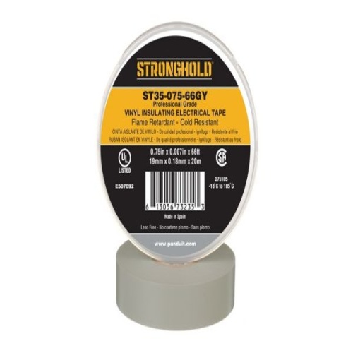 Panduit ST35-075-66GY StrongHold ST35-075-66GY Professional Grade PVC Electrical Tape is a pressure sensitive vinyl electrical tape that applies easily and provides a high level of performance over a range of temperatures. It has excellent elasticity and insulating properties and it is .75" x 66' x .007" in size. It is gray in color and comes in an individual plastic puck. Suitable as primary insulation when used for splicing up 600 Volts or 80∘C (176∘F) and can be used as protective jacketing..