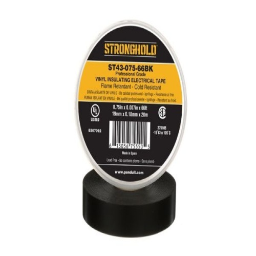 Panduit ST43-075-66BK StrongHold ST43-075-66BK Professional Grade PVC Electrical Tape is a pressure sensitive vinyl electrical tape that applies easily and provides a high level of performance over a range of temperatures. It has excellent elasticity and insulating properties and it is .75" x 66' x .007" in size. It is black in color and comes in an individual plastic puck. Suitable as primary insulation when used for splicing up 600 Volts or 80∘C (176∘F) and can be used as protective jacketing.
