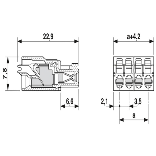 Phoenix Contact 1952432 The PCB connector, with a nominal cross-sectional area of 1.5 mm² and a green color, is rated for 8 A of current and has a maximum allowed voltage of 160 V. It features a socket connection style, with 19 potentials, and uses a push-in spring connection method. The pitch between connections is 3.5 mm, and it is compatible with the FMC 1,5/ST product range. This connector does not require locking or mounting, as it is packaged in cardboard.