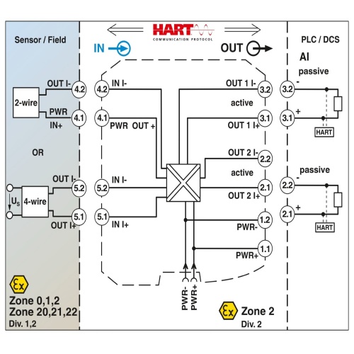 Phoenix Contact 2865366 A repeater transmits power supply and input signal conditioned signals from the Ex area to two loads in the safe area. It has one channel, is HART-transparent, and features a standard configuration with three-way isolation. The system operates at SIL level 2 and ISO 13849 performance level d/KAT 2, boasts systematic capability level 3, and uses screw connections for easy installation.