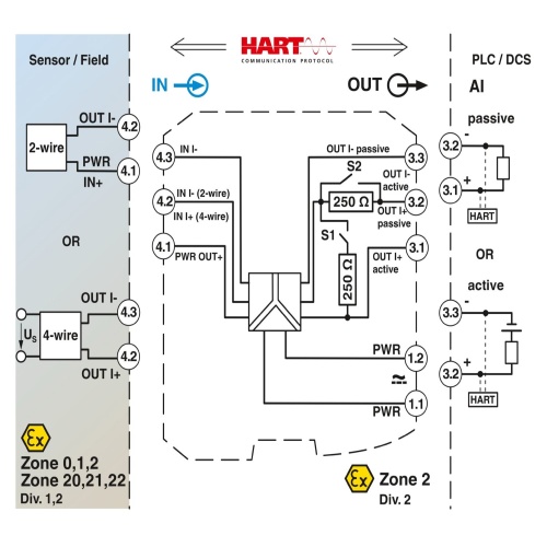 250 Ω resistor that can be activated via DIP switches to increase HART impedance for low-resistance systems