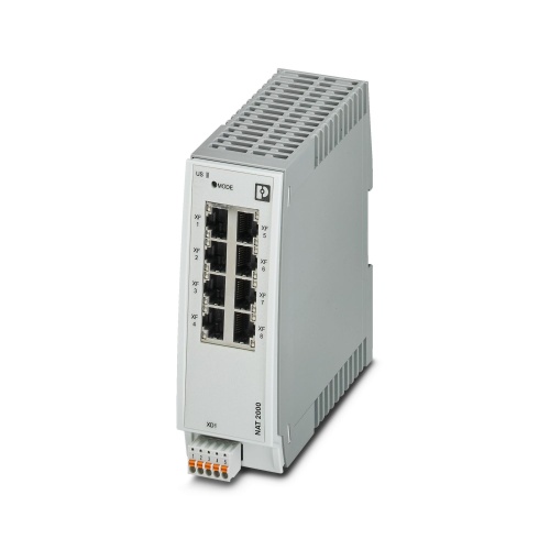 Phoenix Contact 2702881 The Managed NAT Switch 2000 series features 8 RJ45 ports with 10/100 Mbps connectivity and is designed to provide a high degree of protection against harsh environments, with an IP20 rating. It also supports PROFINET Conformance-Class A and offers various networking functionalities including 1:1-NAT, Virtual NAT, and IP-Masquerading. Additionally, the device's development process has been certified in accordance with IEC 62443-4-1, ensuring it meets rigorous security standards, and is compatible with IEC 62443-4-2 as well.