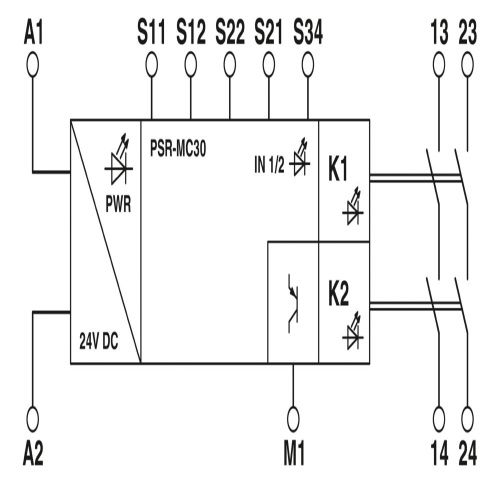 Phoenix Contact 2700499 A safety relay for emergency stops and safety doors is available with various configurations, including up to SIL 3, Cat. 4, and PL e ratings, offering both automatic and manual start options. It can be operated using one or two channels and features cross-circuit detection for enhanced safety. The system also includes monitored start capabilities and has two enabling current paths. The device is compatible with US voltage DC power at 24V and comes equipped with a plug-in push-in terminal block, making it suitable for various applications requiring high levels of safety and reliability.