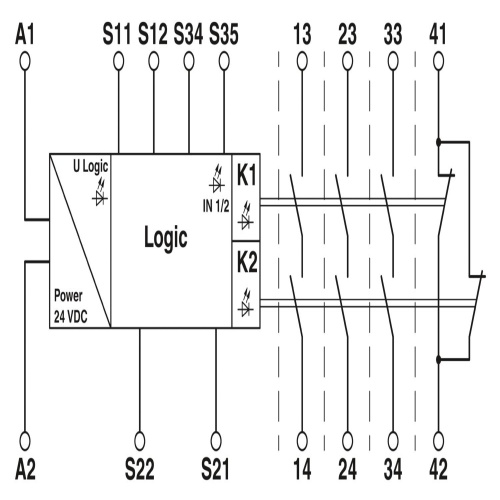 Phoenix Contact 2900509 A safety relay provides emergency stop and safety door monitoring capabilities up to SIL 3 or Cat. 4, PL e standards as defined in EN ISO 13849, supporting two-channel operation with three enabling current paths, operating within a nominal input voltage of 24V DC, utilizing a plug-in screw terminal block for convenient connection options.