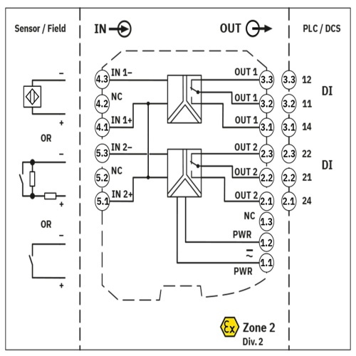 Phoenix Contact 2924304 A 2-channel NAMUR signal conditioner has a wide range power supply suitable for proximity sensors and switches, offering flexible signal output options through each channel's associated relay with a changeover contact available. This device also features line fault detection (LFD), 3-way isolation, push-in connection capabilities, and meets SIL 2 standards.