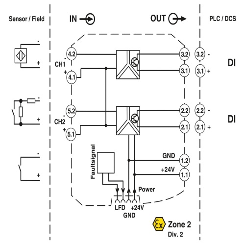Phoenix Contact 2865036 The NAMUR 2-channel signal conditioner is designed to process signals from proximity sensors and switches before transmitting them to a higher control level via passive transistor outputs. It features line fault detection, three-way electrical isolation, and meets the SIL 2 standard for reliability, with connections made through screws.
