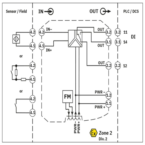 Input for NAMUR proximity sensors (EN 60947-5-6), floating contacts or contacts with resistance circuit