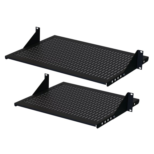 The shelf mounts to either the front or rear flange of an open-frame rack