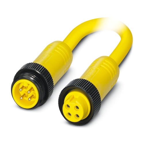 Phoenix Contact 1416816 A power cable with a 4-position configuration, made of PVC material and a yellow color, features a straight plug attached to a socket also having a straight connection. The plug is rated for 7/8"-16UNF threads and is coded as A, while the socket has the same rating and coding on its other end.
