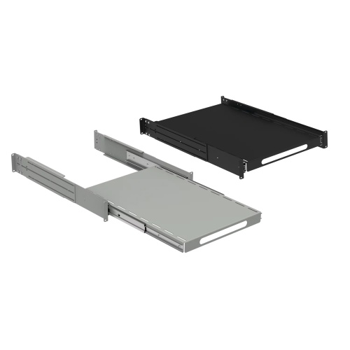 Rack-Mount Sliding Shelf for easy access to shelf-mounted devices. Load rating is 150 lbs. with four rack angle mountings and 75 lbs. with front rack angle mounting when mounted directly to a frame. 16-gauge steel with 12-gauge steel supports. Black polyester powder paint fiish. Shelf mounts to the front surface of front and back rack angles.