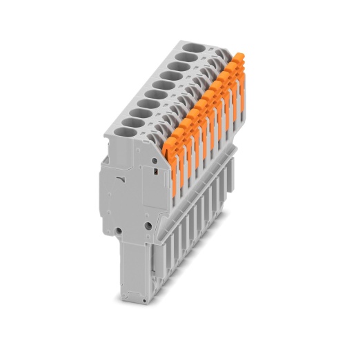 Phoenix Contact 1071721 The plug features an 800 V voltage rating and a nominal current capacity of 24 A, accommodating up to 10 different positions for connections. It utilizes a Lever Push-in connection method and has a rated cross-sectional area of 2.5 mm², with a usable range between 0.14 mm² and 4 mm², and is identified by its gray color.