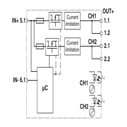 Phoenix Contact 1344364 A two-channel electronic circuit breaker module is designed to protect DC loads, including 12V and 24V configurations, against overload and short circuits. The nominal current range can be adjusted from 2A to 10A using a step switch, providing flexibility in load protection. This module meets the EX e approval standard for use in Zone 2 environments and is suitable for DIN rail installation via CAPAROC current rails.