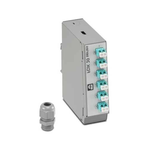 Phoenix Contact FOC-FDX20-PP-LCD6-OM3-PT9 - Splice box, design: Rail-mountable module, degree of protection: IP20, material: Metal, connection method: Splicing, cable outlet: above and below, housing size: 1, color: gray - 1343378