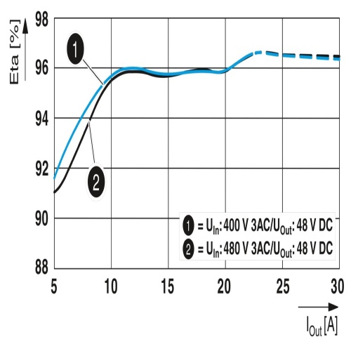 Phoenix Contact 2904627 The Quint Power primary-switched power supply offers flexibility in choosing the desired output characteristic curve, features Selective Fuse Breaking technology, and includes an NFC interface. It can be powered by a 3-phase source and provides a DC output of 48V at a maximum current of 20A.