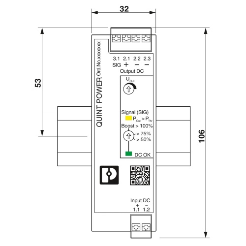 Phoenix Contact 1066708 The QUINT POWER is a primary-switched DC/DC converter designed for DIN rail mounting, suitable for applications requiring an adjustable output voltage between 48V and 110V DC, with a fixed output of 24V DC at 2.5A.