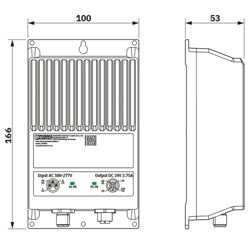 Phoenix Contact 1376306 The TRI-O POWER is a primary-switched power supply unit that comes with an M12 circular connector, suitable for panel mounting. It provides a single-phase power input and delivers a constant DC voltage of 24V at a maximum current output of 3.75A.
