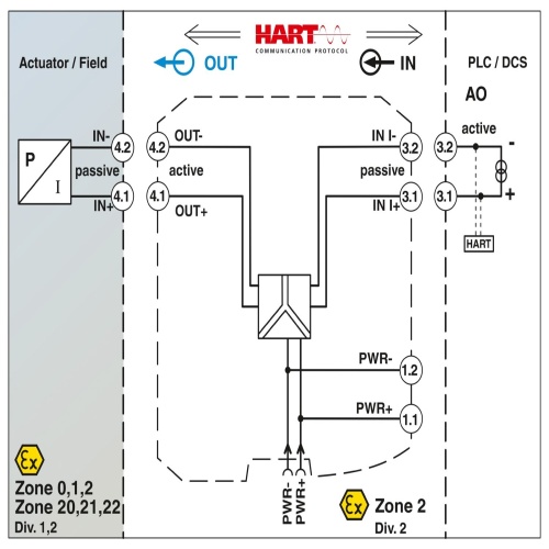 Phoenix Contact 2908062 An output signal conditioner designed for Exi environments, it safely isolates and transmits low current signals of 0-20mA between a safe area and an explosive zone, featuring triple electrical isolation, line fault detection that can be switched off via a DIP switch, and meets SIL 2 (SC3) safety standards as per IEC 61508, with push-in connection.
