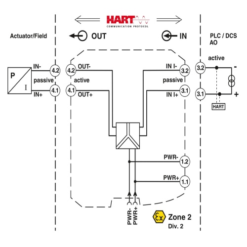 Phoenix Contact 2908064 The output signal conditioner is designed to safely transmit 0/4 mA ... 20 mA signals from a hazardous area to a load in a safe area, featuring three-way electrical isolation and line fault detection that can be switched off via a DIP switch. It meets the SIL 2 (SC3) standard in accordance with IEC 61508, allowing for reliable operation, and is connected using push-in terminals.