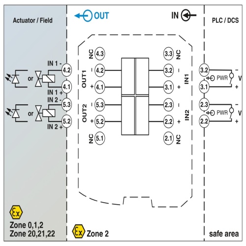 Phoenix Contact 1291186 An ex-solenoid driver is designed to activate ex-i solenoid valves, alarm transmitters, or displays in hazardous areas while maintaining intrinsic safety. The device supports up to 2 channels and features a standard configuration with loop-powered operation, providing 4-way isolation. It meets the SIL 3 and IEC 61508 safety standards, making it suitable for applications requiring high reliability. Connection to the driver is achieved via push-in connections.