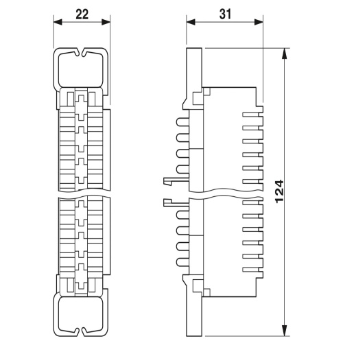 Phoenix Contact 2765356 The LSA-PLUS disconnect strip is used to secure both the CTM (current transformer module) and CT 10 (protection module) in place, featuring a double-conductor design with dimensions of 124 mm.