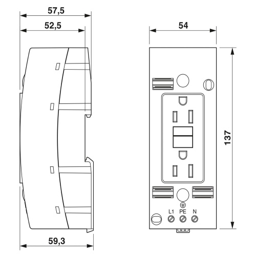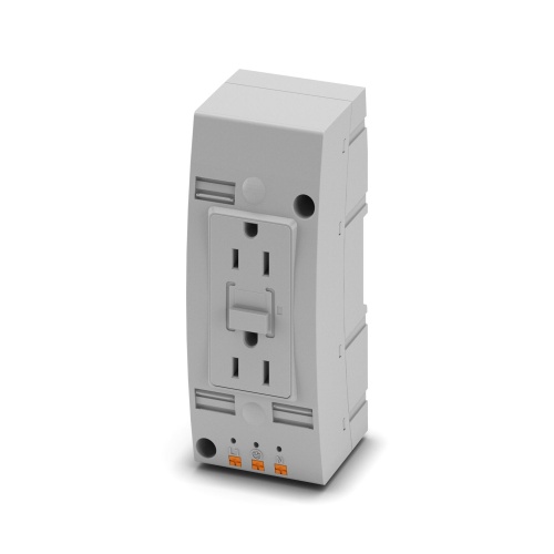 Phoenix Contact EO-AB/PT/LED/DUO/V/GFI/15 - Double socket, in vertical arrangement, integrated residual current operated circuit breaker (GFCI Class A), Pin connector pattern type AB 15A, connection method: Push-in spring connection, color: gray, nom. voltage: 125 V AC (60 Hz), nominal current: 15 A, DIN rail or direct mounting, standards/specifications: UL 508A, Country marking: USA - 1263626