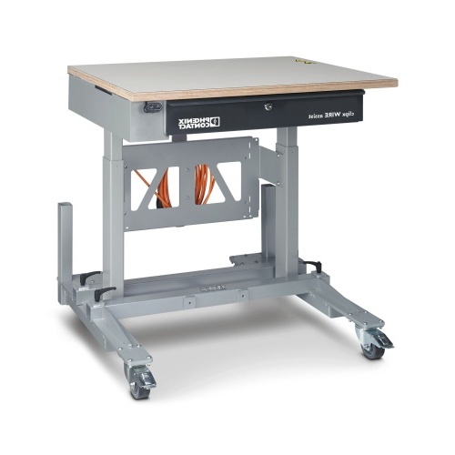 Phoenix Contact 1194550 A mobile workbench is equipped with an adjustable electric height feature, allowing users to customize their working surface. The workbench also comes with various holder systems, including device carriers and shelves, which can be used to organize and store items such as automatic tools, printers, hand tools, and accessories, making it a versatile basis for other workshop applications like the clipx WIRE assist system.