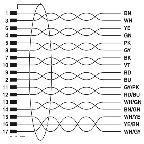 Phoenix Contact 1430271 A sensor or actuator cable with a 17-position connector is made of a flexible polyurethane (PUR) and polyvinyl chloride (PVC) material in black RAL 9005 color, has shielding for improved protection against electromagnetic interference, features an angled M12 SPEEDCON plug on one end with a coding of "A", and extends 10 meters from the coded end.
