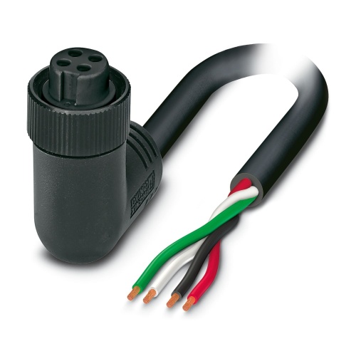 Phoenix Contact 1417126 A power cable with a 4-position configuration is provided, made from PVC material and has a black finish. It comes with a free cable end and features an angled socket that accepts a 7/8"-16UNF connection, identified by code "A" and measuring approximately 10 meters in length.