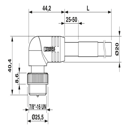 Phoenix Contact 1416850 A power cable with a 6-position configuration is made of PVC and features an angled plug that accepts a 7/8"-16UNF connector with a coding of "A", while the socket has the same specifications. The cable itself measures 2 meters in length.