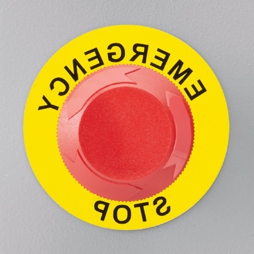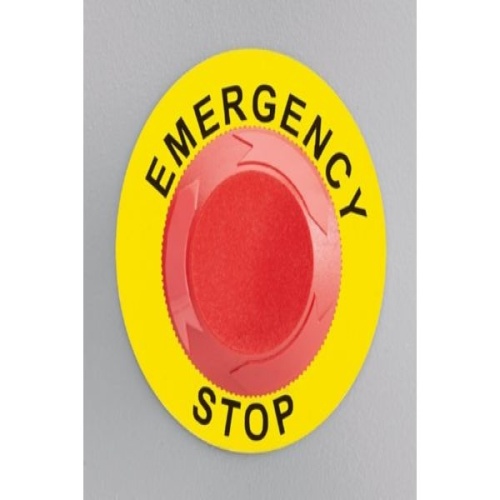 Pre-printed raised panel Emergency Stop label, Black on Yellow, 89mm diameter x 30.5mm hole.