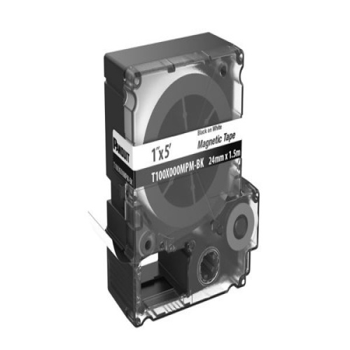 The T100X000MPM-BK Magnetic Continuous Tape Cassette includes both label material and ribbon for easy changeover. Print custom pipe markers, voltage markers, signs, bin markers, and network identification labels on demand. For flat label applications only. For use with the MP100 and MP300 printers. Magnetic. 1" x 4.9' (25.4 mm x 1.5 m). Color Black on White. 1 cassette per package.