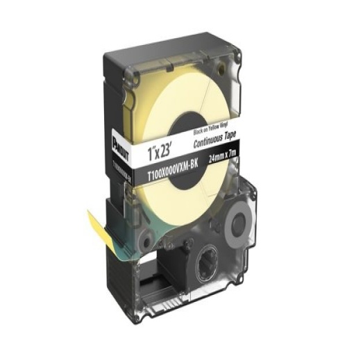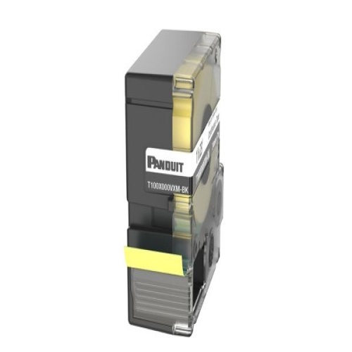 Panduit T100X000VXM-BK vinyl continuous tape cassettes are quick and easy to load. These label cassettes, used with our EasyMark™ Plus labeling software, allows you to create custom pipe markers, voltage markers, signs, bin markers and network identification labels on demand. Continuous tape is yellow in color and is 1.0" wide x 23 ft long. For use with Panduit MP series printers.
