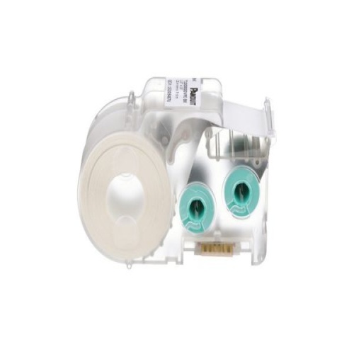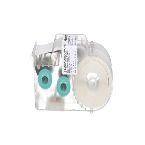 The T100X000VPC-BK Continuous Tape Cassette includes both label material and ribbon for easy changeover. The label cassette contains an integrated memory device for automatic formatting, recall of last legend used, and the number of labels remaining in the cassette. For use with LS8E and LS8EQ printers. Vinyl. 1" x 25' (25.4 mm x 7.6 m). Color Black on White. 1 cassette per package.