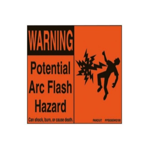NEC warning label, 3.5" H x 5.0" W (88.9mm x 127.0mm), warning header, 'Arc flash and shock hazard appropriate PPE required...' (legend) with symbol, vinyl adhesive, orange header and black/white, 1 sign/card, 5 cards/package.