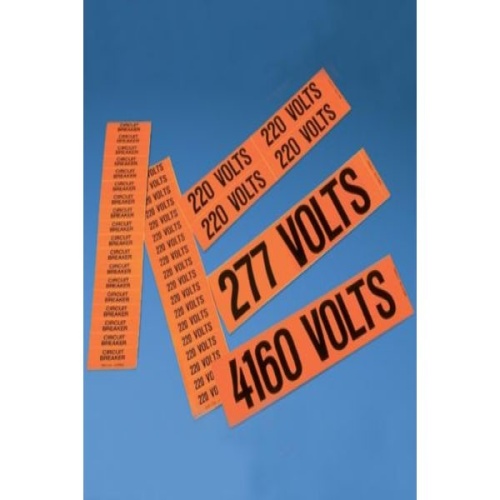 Voltage marker, 9.0" W x 2.25" H, '208 Volts' (legend), vinyl, black/orange, 1 marker/card, 5 cards/package.