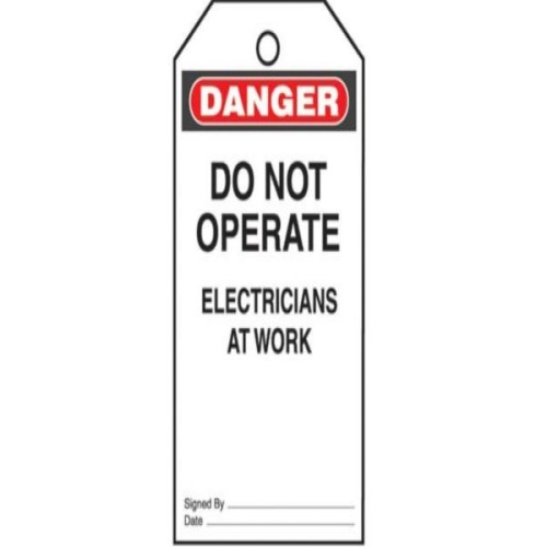 Write-on safety tag, 3.00" W x 5.75" H, danger header, 'Do not operate electricians at work' (legend), semi-rigid vinyl, red and black/white, 25 tags and ties/package.