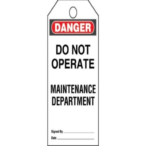 Write-on safety tag, 3.00" W x 5.75" H, danger header, 'Do not operate maintenance department' (legend), semi-rigid vinyl, red and black/white, 5 tags and ties/package.