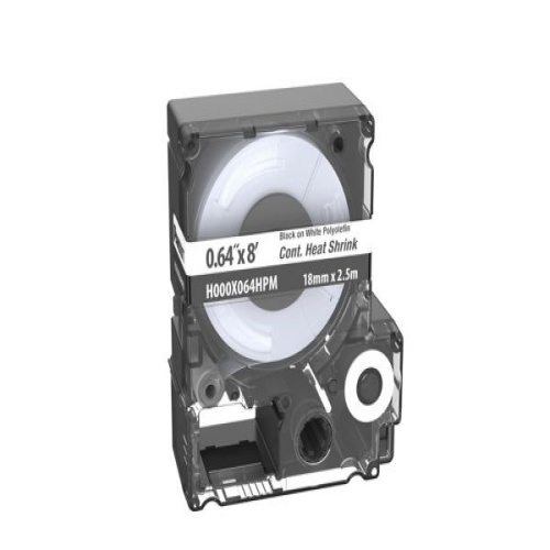 The Portable Printer continuous Heat Shrink Labels in White are made of 2:1 Military-Grade Polyolefin. They measure 0.64" (16.3mm) Diameter, 8' (2.4 m) Length, and have a wire range of 8 - 2 AWG. The Fast-Loading MP™ Label Cassette includes both Label Material and Ribbon for Easy Label Changing.