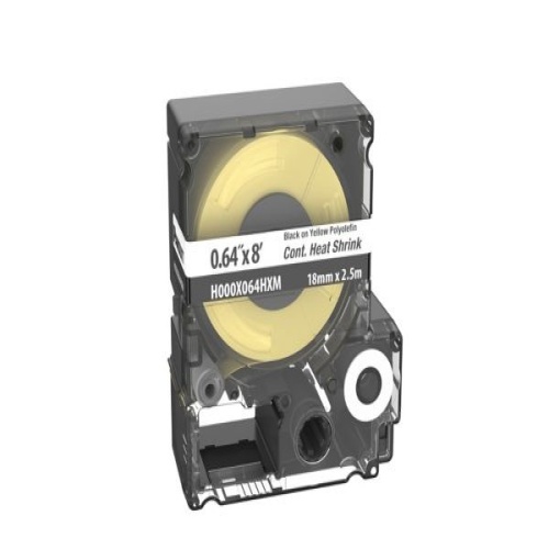 The Portable Printer continuous Heat Shrink Labels in Yellow are made of 2:1 Military-Grade Polyolefin. They measure 0.64" (16.3mm) Diameter, 8' (2.4 m) Length, and have a wire range of 12 - 6 AWG. The Fast-Loading MP™ Label Cassette includes both Label Material and Ribbon for Easy Label Changing.